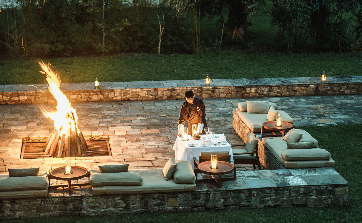 Im Restaurant werden einheimische, asiatische, aber auch westliche Gerichte und Spezialitäten serviert. Eine lange Tafel, eine Feuerstelle und der Innenhof laden zum Dinieren ein.