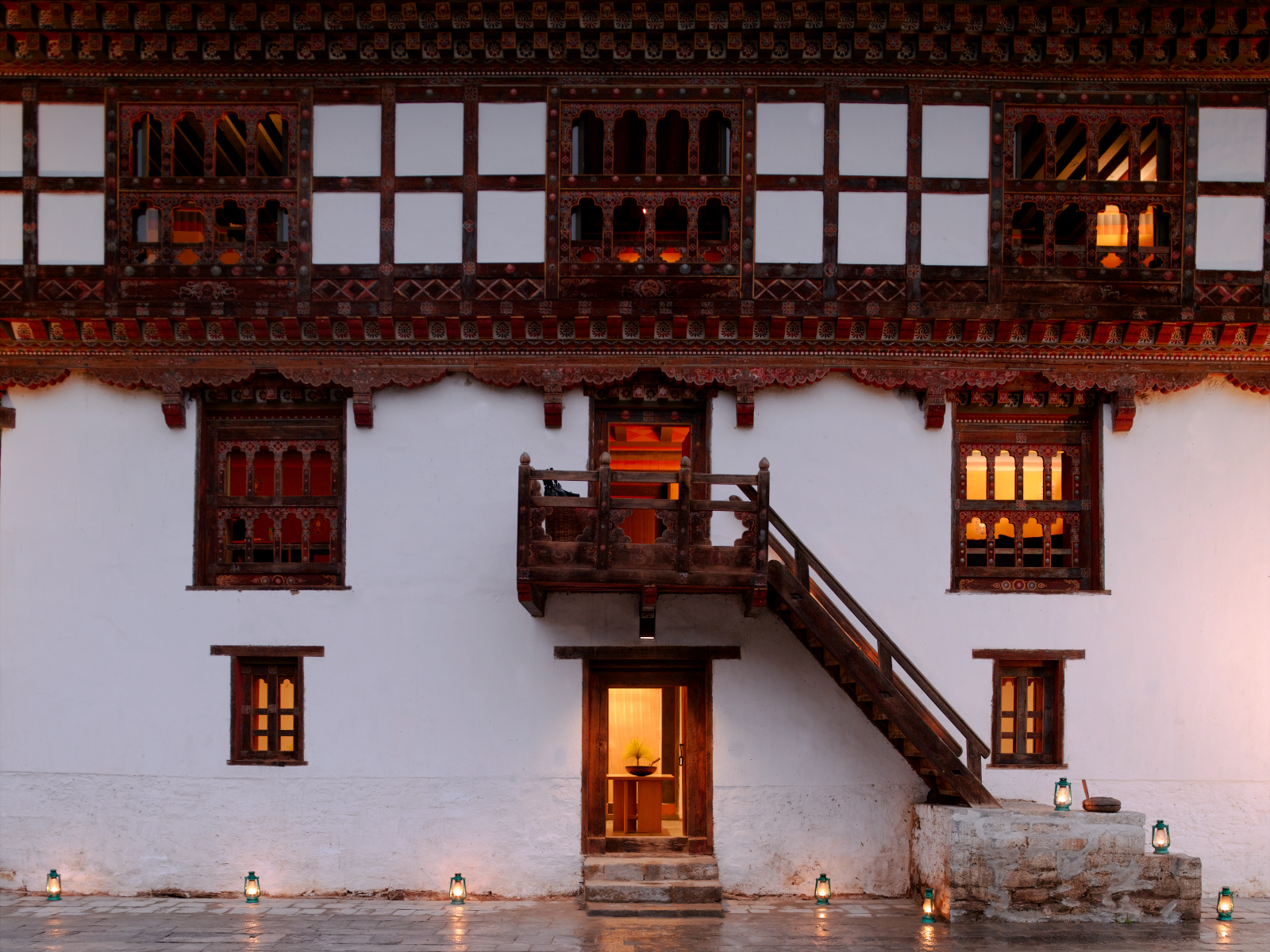 Das Amankora Punakha besteht aus 2 Gebäuden: einem modernen Komplex mit den 8 Gästesuiten (52qm) und einem traditionellen Farmhaus, in dem sich das Aman Restaurant und ein Altarraum befinden. Das Farmhaus gehörte einst der Königsfamilie, die hier ihre Felder und Plantagen im Blick hatten.