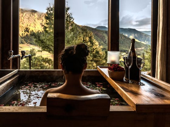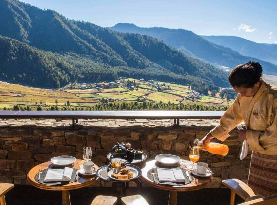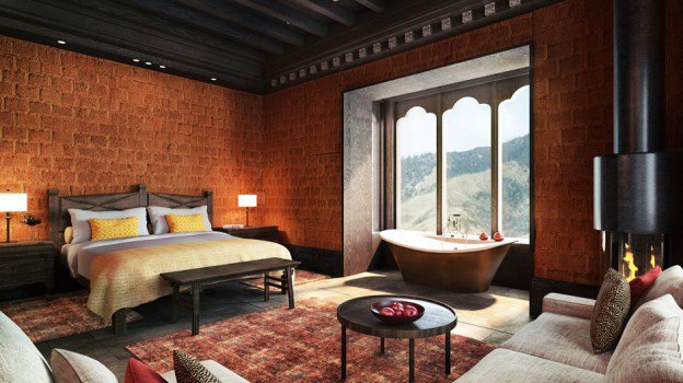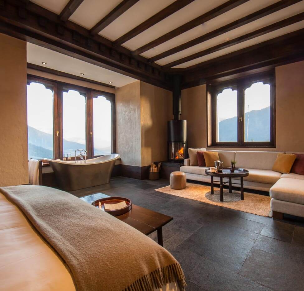 Die Lodge bietet 12 luxuriöse Famhouse-Suiten (ca. 46qm), geschmackvoll in warmen Erdtönen gehalten mit Fußbodenheizung, einem traditionellen Bukhari (Holzofen) sowie Sofa mit Sitzecke. Jede Suite bietet einen atemberaubenden Blick auf das weite Phobjikha Tal und die umliegenden bewaldeten Berge.